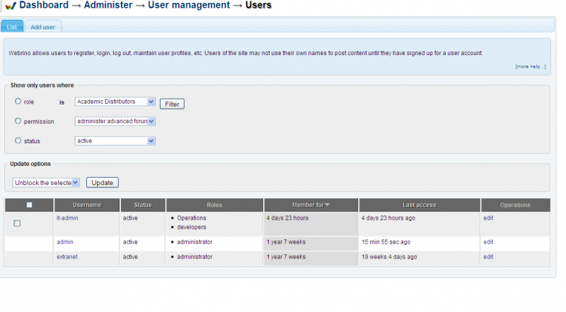 - List tab shows all the existing users with options to filter the list; a fresh instance of dashboard would have the two system level users, which cannot be edited