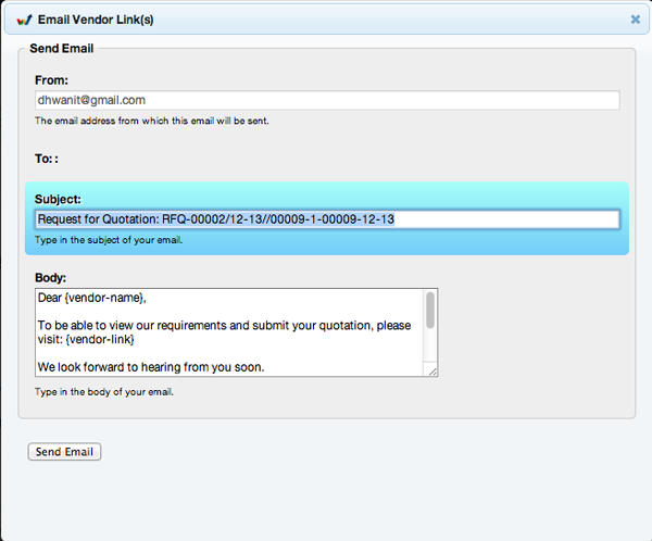 - Fill in details that you would want to send out to the Vendor, including vendors email ID