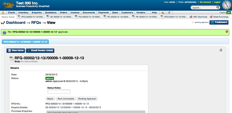 Once an enquiry has been added, vendors have been chosen and RFQs have been generated, the next step is to send out the RFQs to the selected vendors. Once this is done, vendors can enter details of their quotation into the RFQ and send it back for further processing.